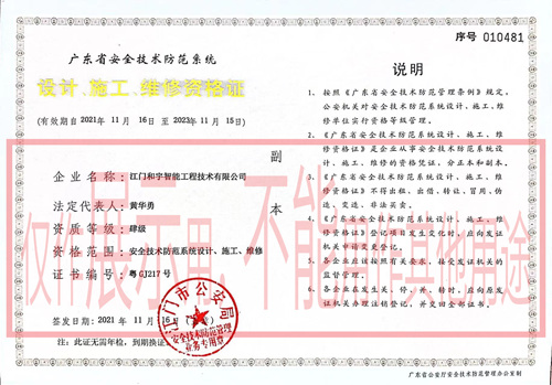 獲得廣東省公安廳頒發<<廣東省安全技術防范系統,設計,施工,維修資格證>>的安防設計,施工,維修于一體的企業。
